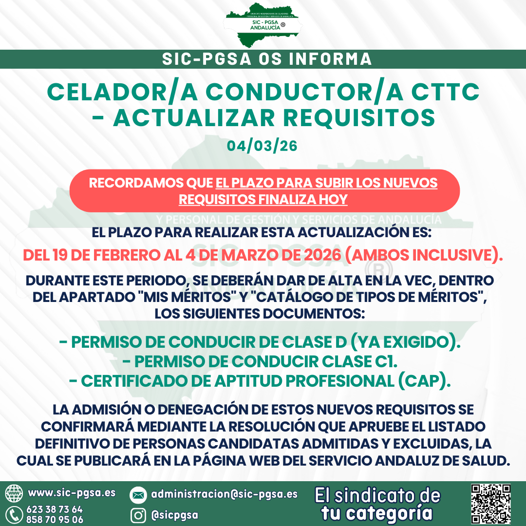 ACTUALIZAR REQUISITOS CELADOR CONDUCTOR CTTC – PLAZO ACABA HOY 04/03/26