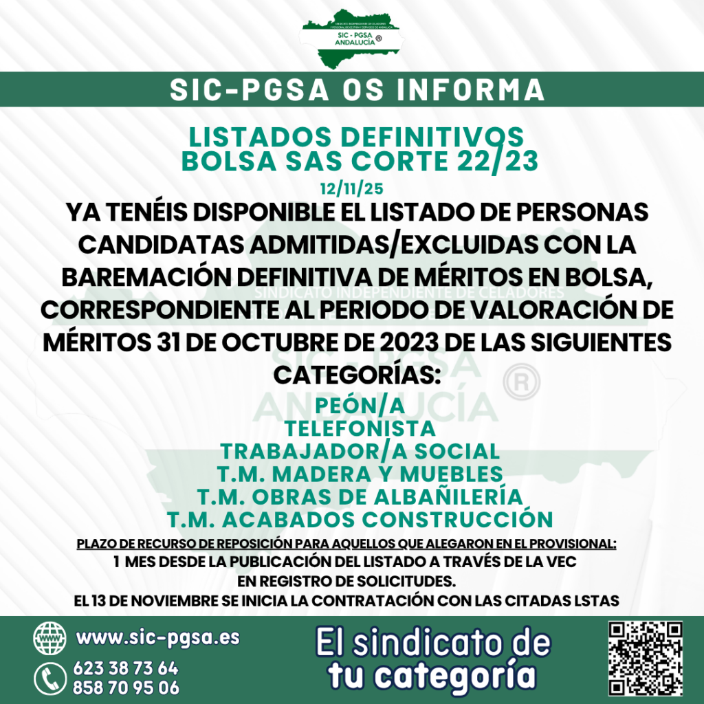 ℹ️Disponible listado de personas candidatas admitidas/excluidas con el baremo definitivo de méritos de Bolsa: