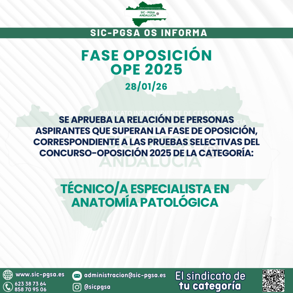 Listado de personas aspirantes que superan la fase de oposición TECNICO/A ESPECIALISTA ANATOMIA PATOLOGICA. Convocatorias OEP 2025