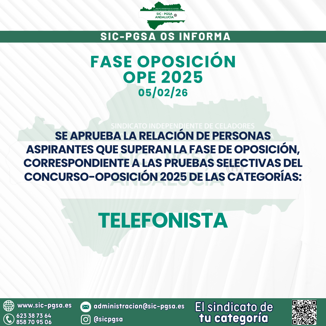 Listado de personas aspirantes que superan la fase de oposición TELEFONISTA. Convocatorias OEP 2025