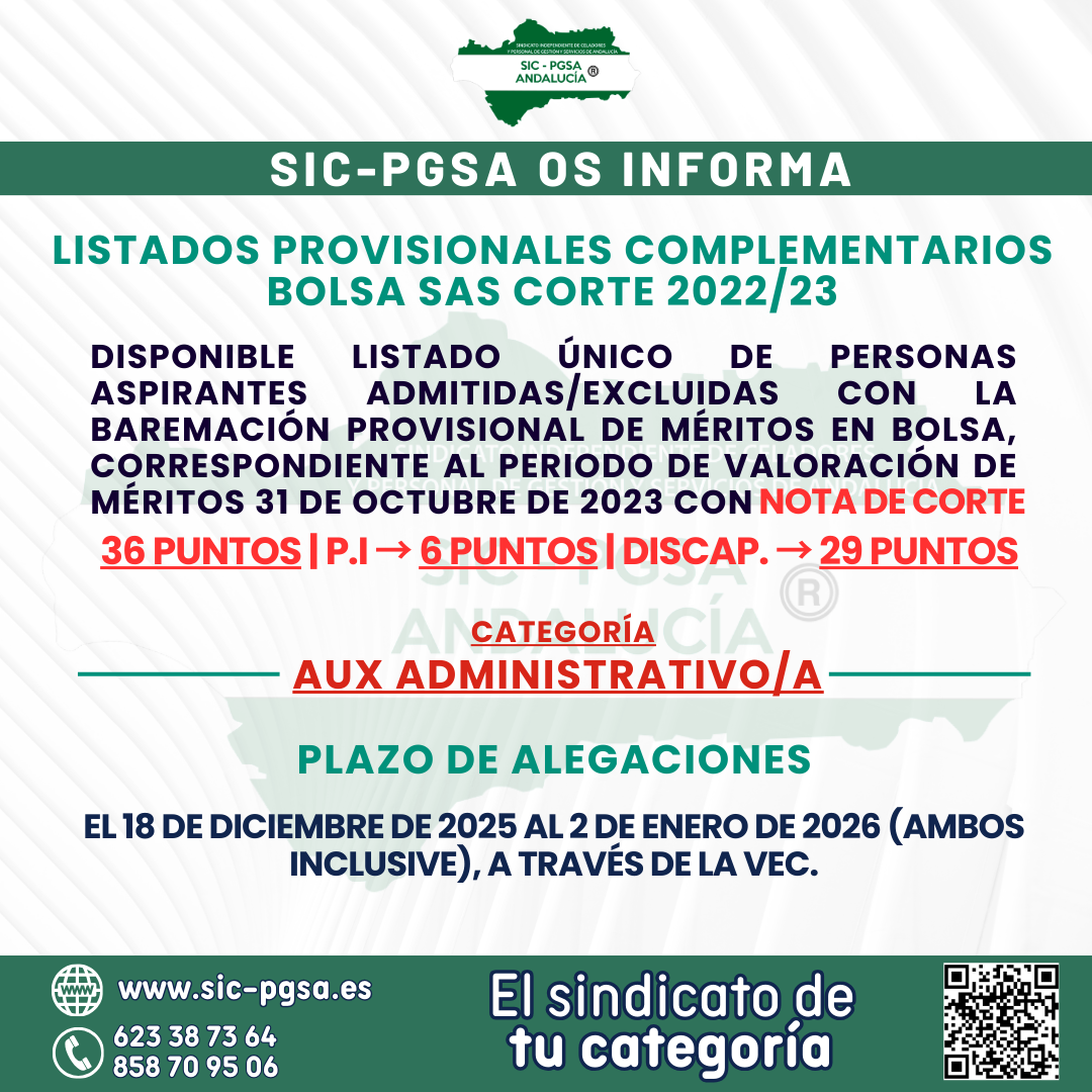 LISTADOS PROVISIONALES COMPLEMENTARIOS BOLSA SAS CORTE 22/23 AUX.ADMINISTRATIVO